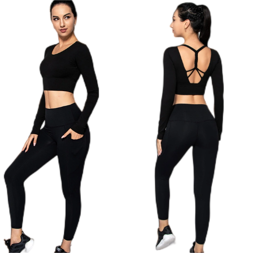 Women Two Piece Yoga Active Wear Long Sleeve Crop Top Fitness Set